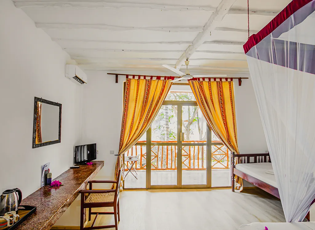 Pokoje w Waridi Beach Resort and Spa są przestronne i zaprojektowane z myślą o zapewnieniu komfortu. Dostępne są pokoje z łóżkiem podwójnym lub dwoma pojedynczymi łóżkami, a wszystkie pokoje wyposażone są w klimatyzację, Wi-Fi oraz sejf na bezpieczne przechowywanie wartościowych przedmiotów. Pokoje oferują relaksującą atmosferę z nowoczesnymi udogodnieniami, które zapewniają przyjemny pobyt.